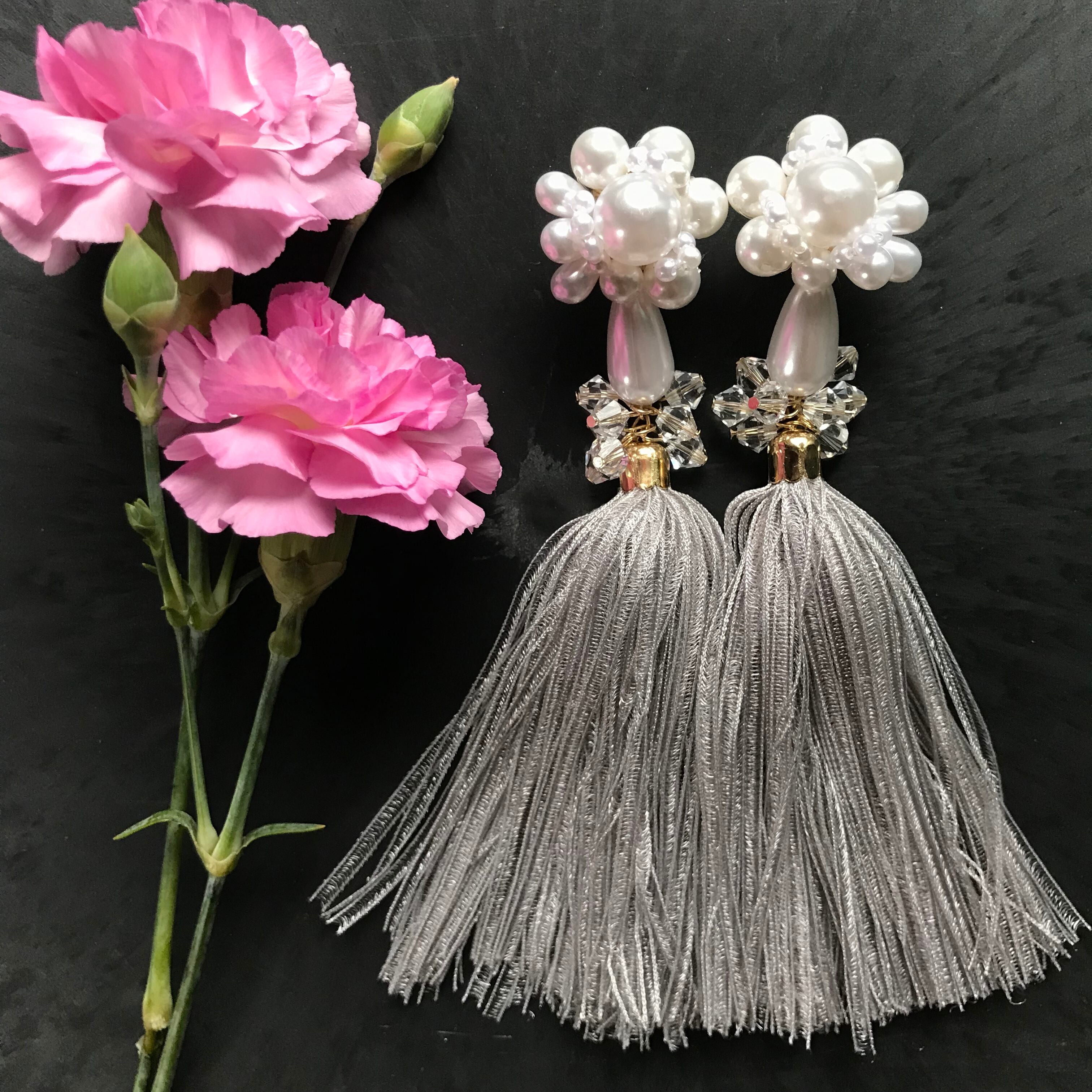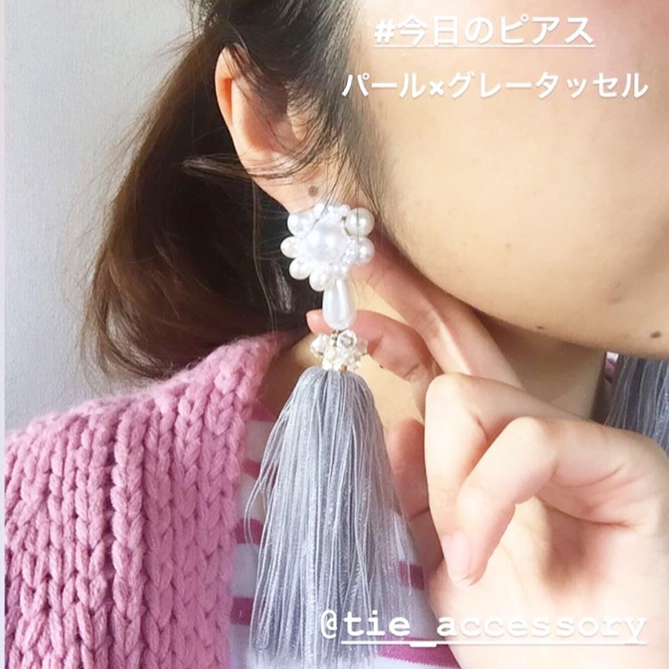 色々なサイズや形のパールと大きなグレーのタッセルを合わせた大人っぽいデザインとなっています。 重さ:約11g/個 ▽アレルギー対応について▽ こちらのピアスはチタンポストとなっております。イヤリングのアレルギー対応は出来かねますのでご了承下さい。 ▽その他▽ アクセサリーは一つひとつ手作業で作成しております。パーツの配置等個々に多少の差が生じます。また製作中にワイヤーなによる微細な傷が付いている場合があります。何卒ご了承下さい。