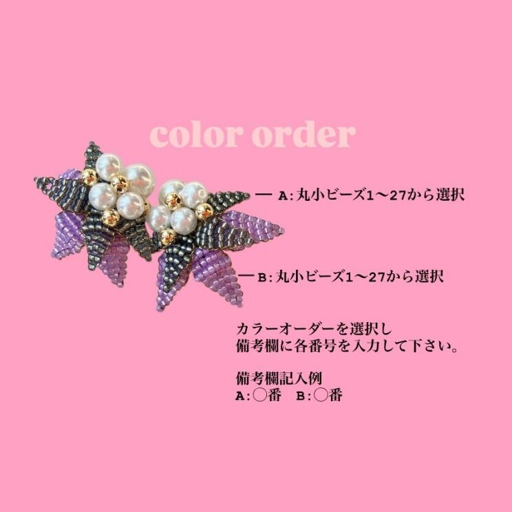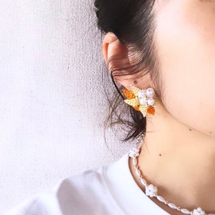 2色のビーズを使った小ぶりながらも存在感のあるアクセサリーです。中央部分にパールとゴールドをあしらいカラフルながらまとまりのあるアクセサリーとなっております。