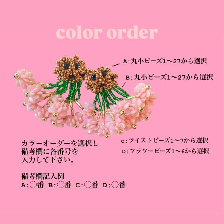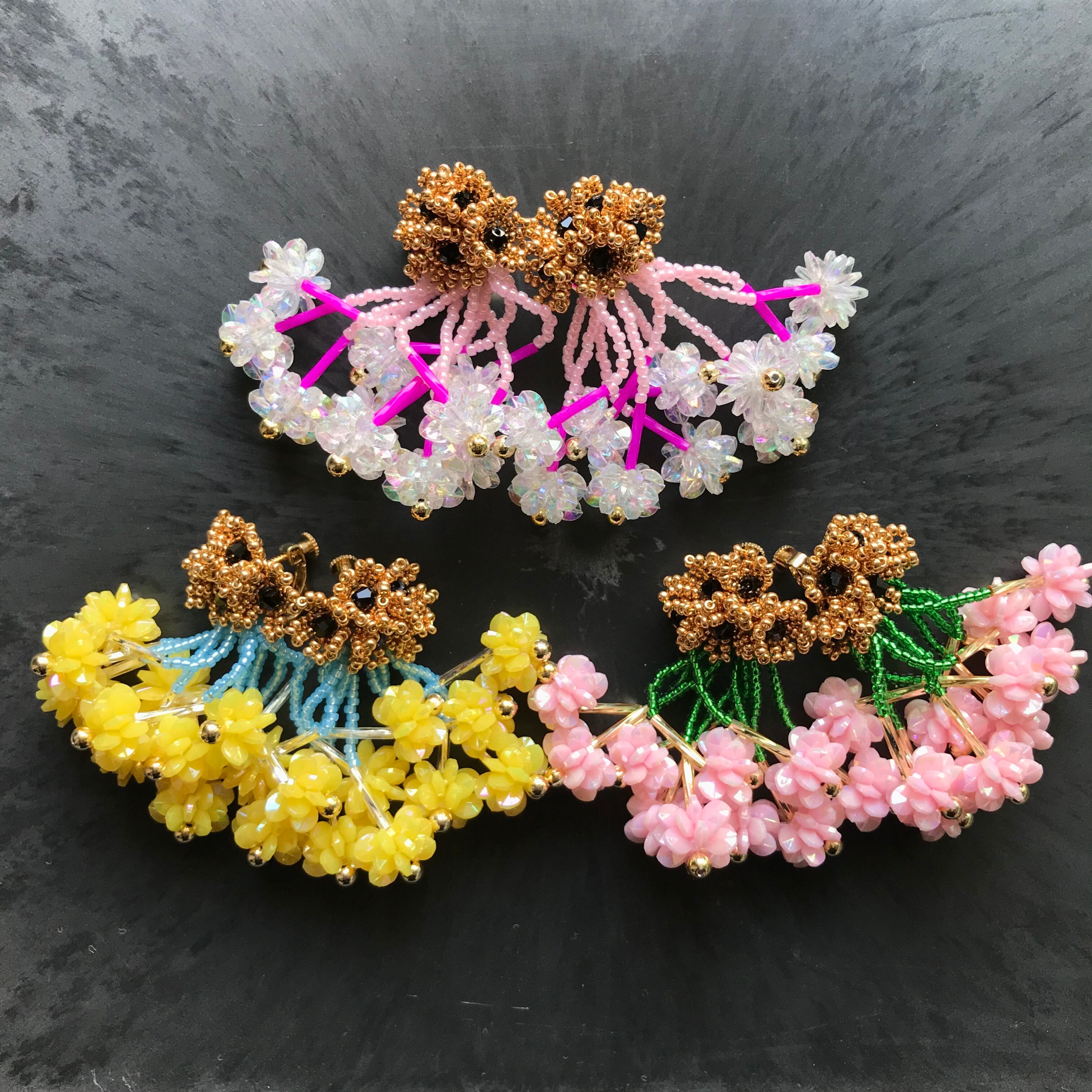フラワービーズや竹ビーズなど様々な形のビーズを使ったアクセサリーです。色、形共に存在感があり他にないデザインとなっております。 重さ:約11g/個 ▽アレルギー対応について▽ こちらのピアスはチタンポストになっております。イヤリングのアレルギー対応は出来かねますのでご了承下さい。 ▽その他▽ アクセサリーは一つひとつ手作業で作成しております。パーツの配置等個々に多少の差が生じます。また製作中にワイヤーなによる微細な傷が付いている場合があります。何卒ご了承下さい。