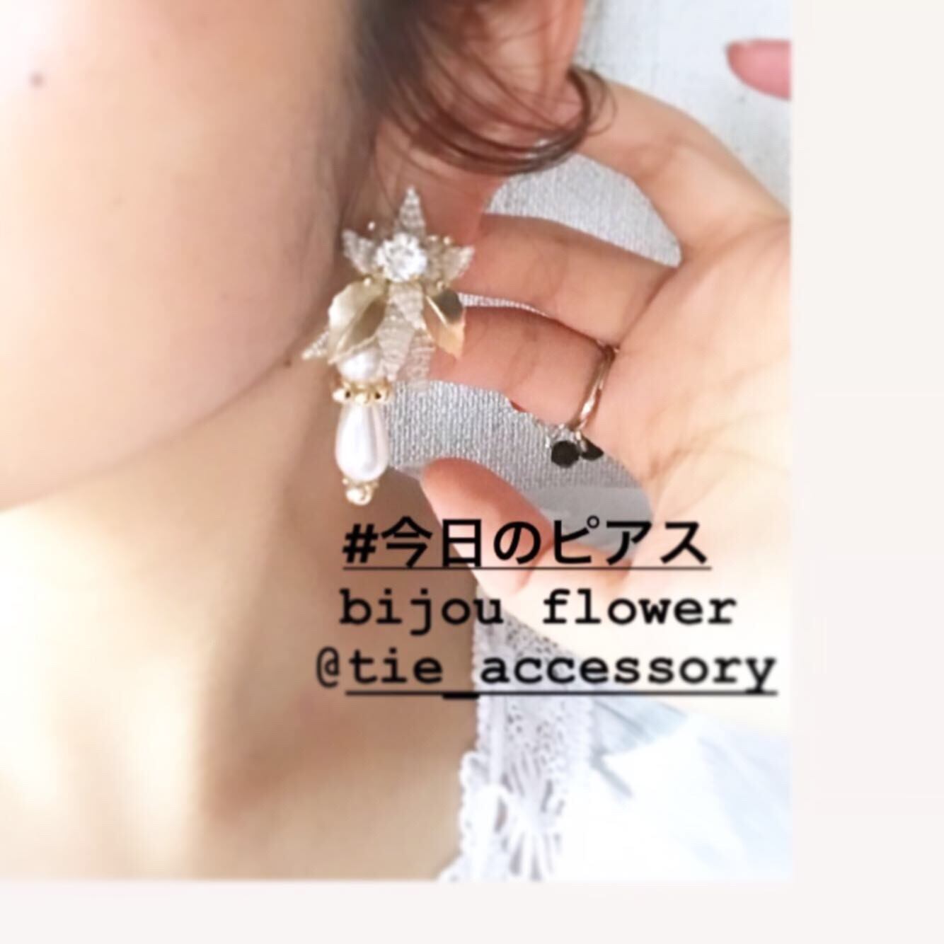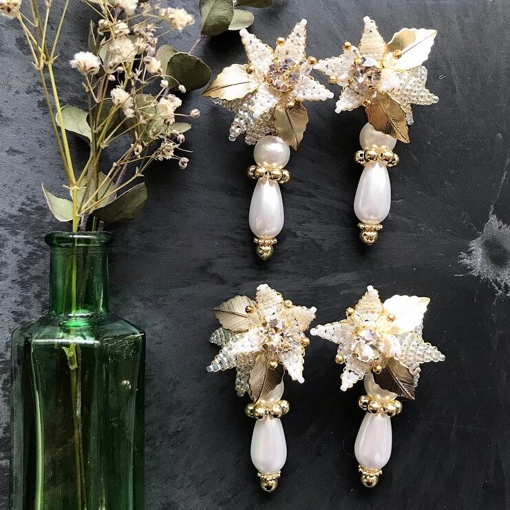 中心にビジューを置き、ビーズの花びらでできています。ゴールドのリーフやパールを使いナチュラながらエレガントなアクセサリーです。 重さ:約8g/個 ▽アレルギー対応について▽ こちらのピアスはチタンポストとなっております。イヤリングのアレルギー対応は出来かねますのでご了承下さい。 ▽その他▽ アクセサリーは一つひとつ手作業で作成しております。パーツの配置等個々に多少の差が生じます。また製作中にワイヤーなによる微細な傷が付いている場合があります。何卒ご了承下さい。