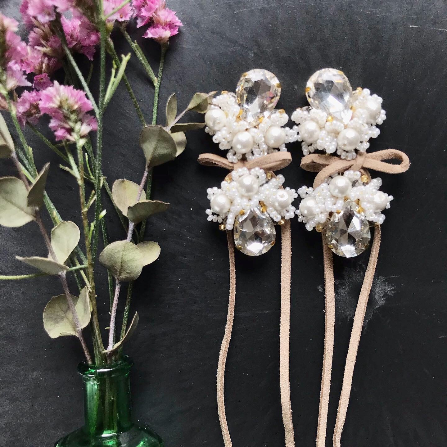 クリスタルのビジューとコットンパールを使ったピアス、イヤリングです。スエードの紐は約15cm程あります。お好きな長さに切って使って下さい。比較的軽いのであまり重さは感じずにご使用いただけます。結婚などパーティにもピッタリのアクセサリーです。