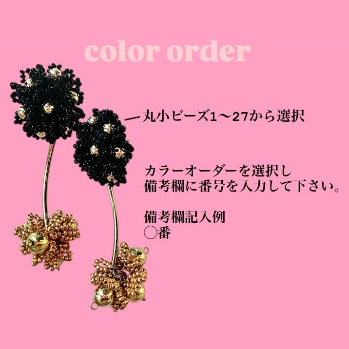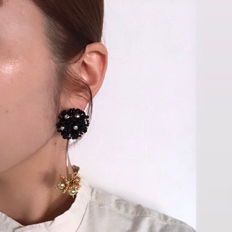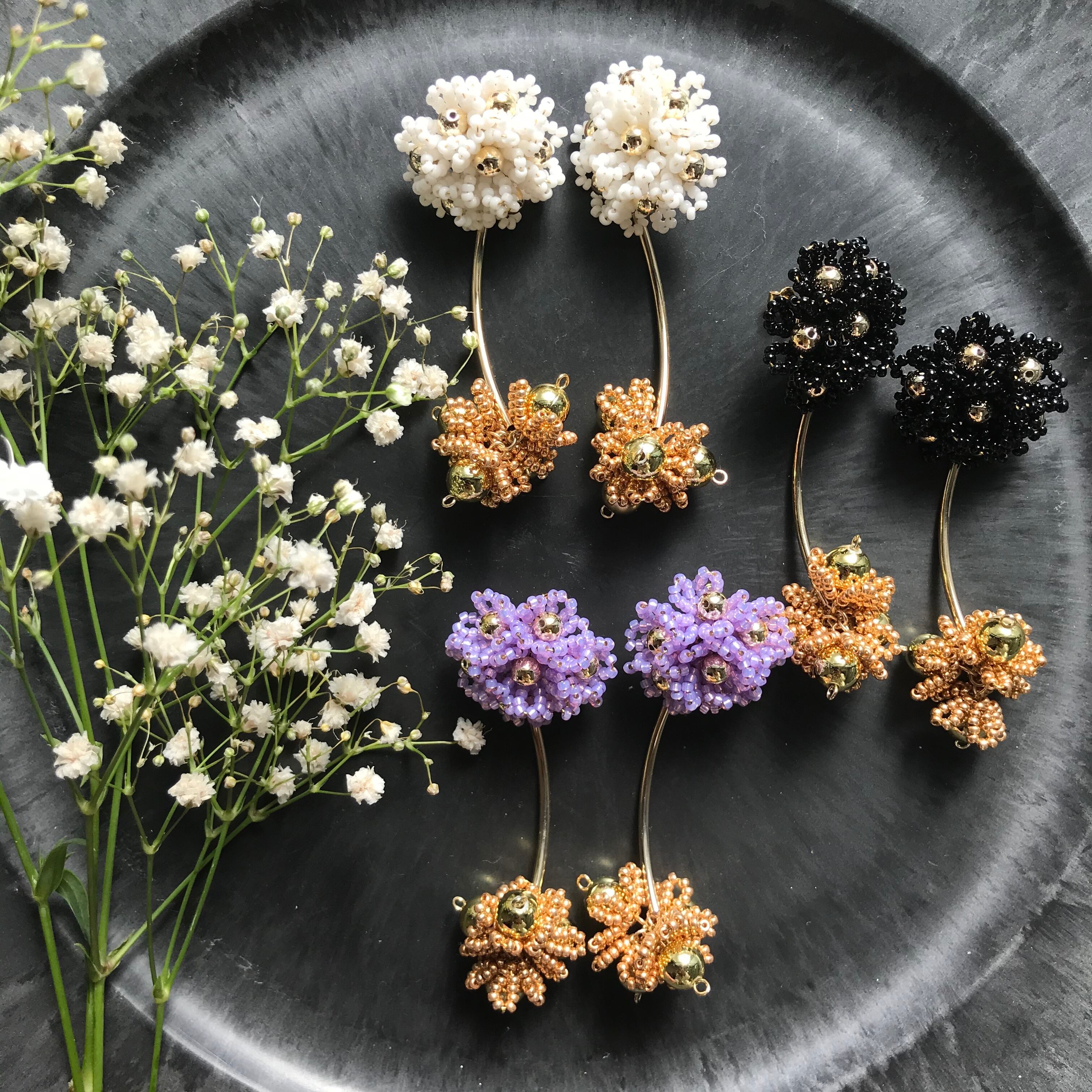 花のモチーフとゴールドのビーズで大人っぽいデザインに仕上げました。揺れるゴールドのビーズがポイントです。 重さ:約10g/個 ▽アレルギー対応について▽ こちらのピアスはチタンポストとなっております。イヤリングのアレルギー対応は出来かねますのでご了承下さい。 ▽その他▽ アクセサリーは一つひとつ手作業で作成しております。パーツの配置等個々に多少の差が生じます。また製作中にワイヤーなによる微細な傷が付いている場合があります。何卒ご了承下さい。