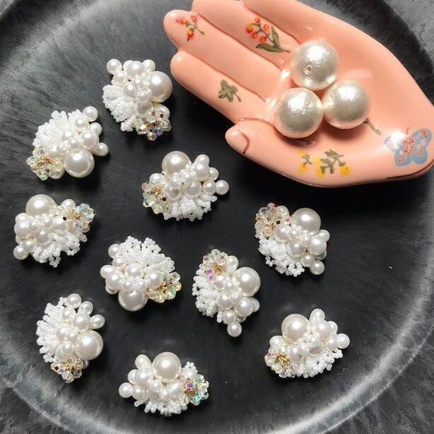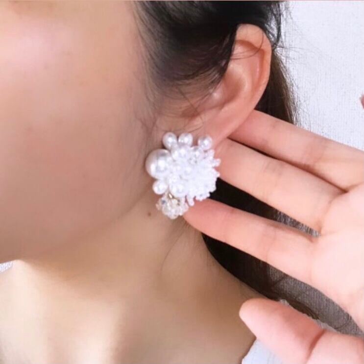パールやビーズ、ガラスビーズなど異素材をホワイトのone colorで仕上げました。シンプルで使いやすいデザインです。 重さ:約7g/個 ▽アレルギー対応について▽ こちらのピアスはチタンポストとなっております。イヤリングのアレルギー対応は出来かねますのでご了承下さい。 ▽その他▽ アクセサリーは一つひとつ手作業で作成しております。パーツの配置等個々に多少の差が生じます。また製作中にワイヤーなによる微細な傷が付いている場合があります。何卒ご了承下さい。