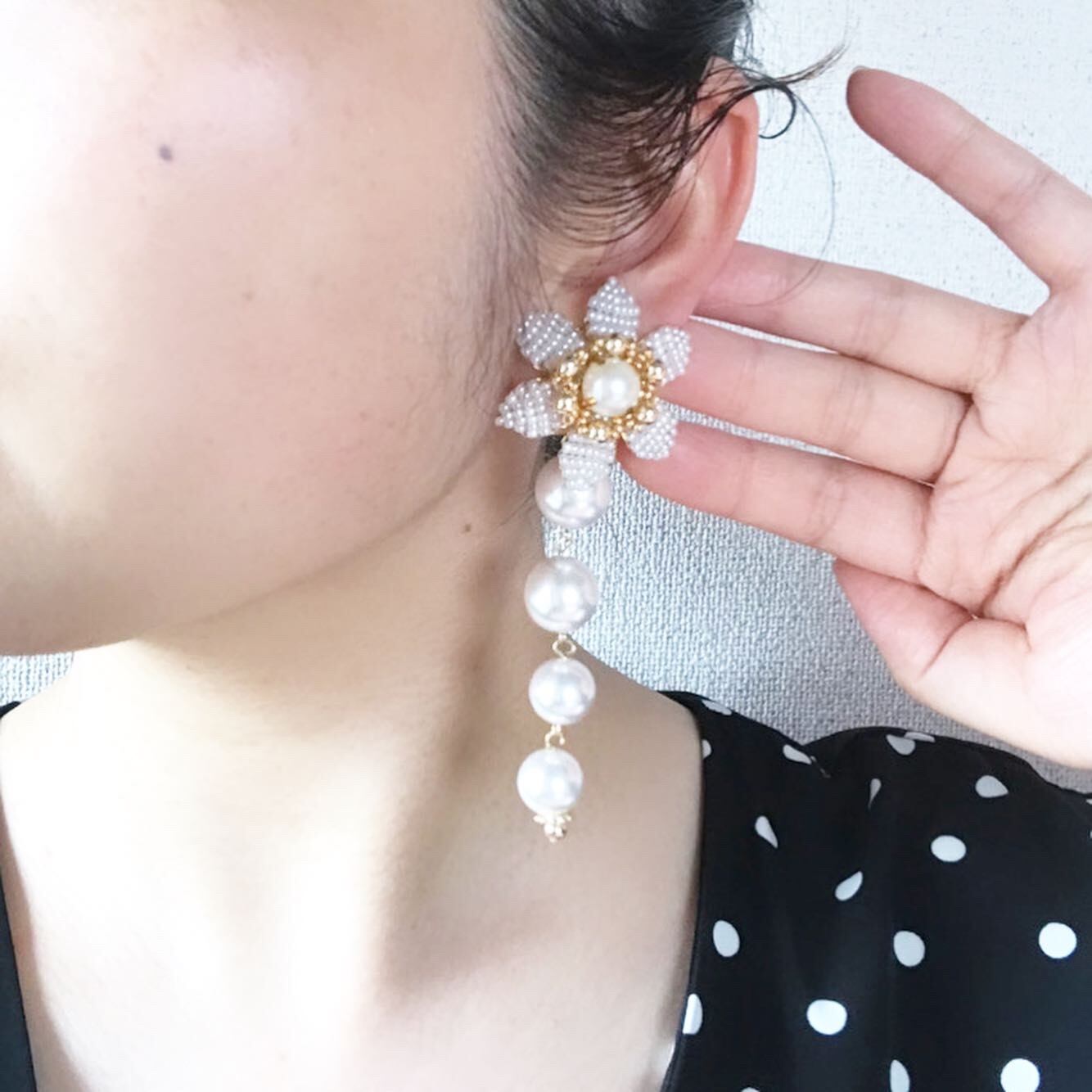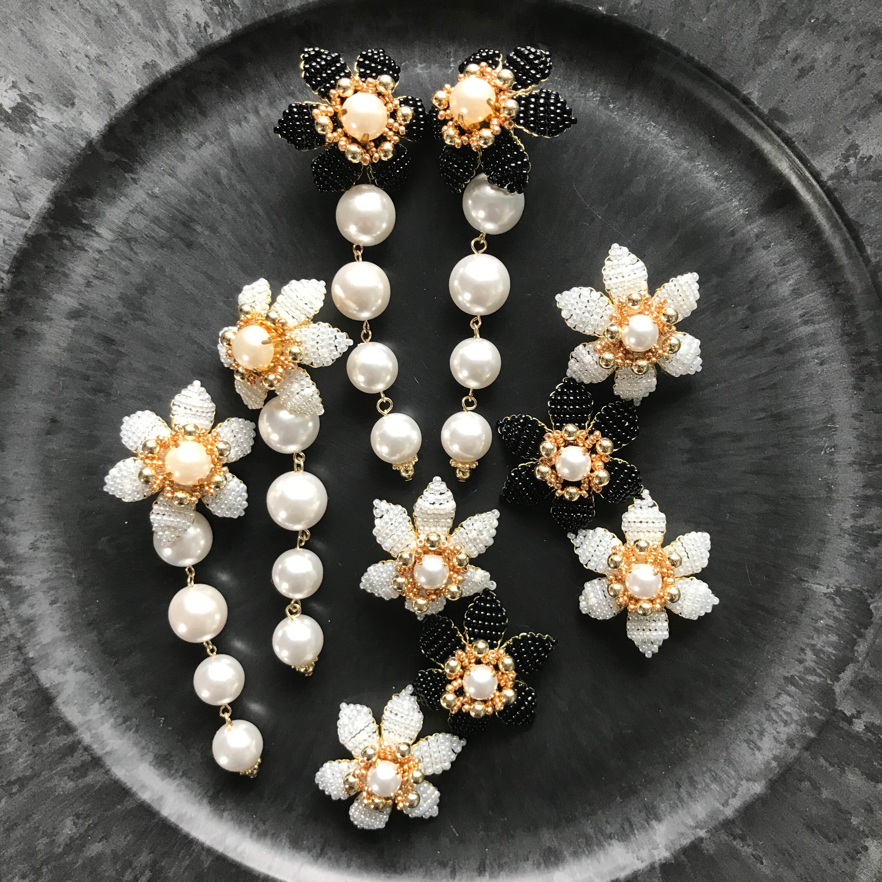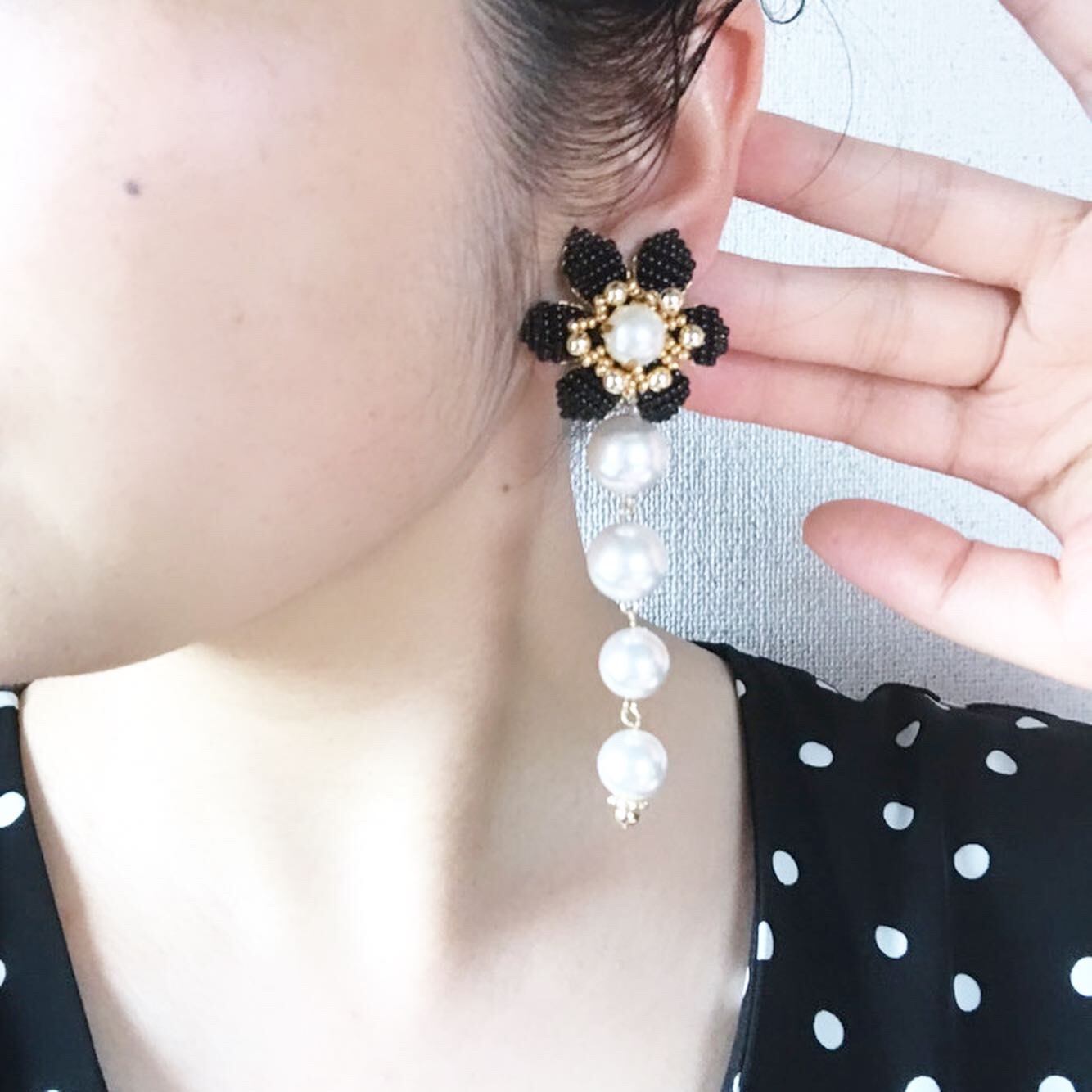 白と黒のビーズとパールを使い、大人っぽい雰囲気のアクセサリーです。大ぶりですが軽く、耳に負担なく使用していただけます。 ▽アレルギー対応について▽ こちらのピアスはチタンポストとなっております。イヤリングのアレルギー対応は出来かねますのでご了承下さい。 ▽その他▽ アクセサリーは一つひとつ手作業で作成しております。パーツの配置等個々に多少の差が生じます。また製作中にワイヤーなによる微細な傷が付いている場合があります。何卒ご了承下さい。