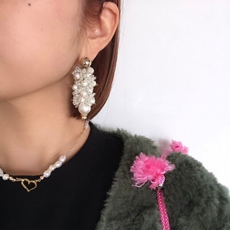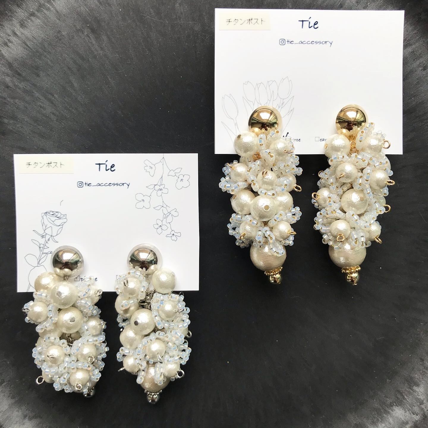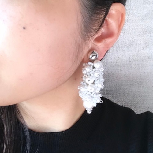 コットンパールと小さなお花モチーフのビーズをふんだんに使用しています。金具部分はゴールドベースとシルバーベースの2種類あります。 重さ:約11g/個 ▽アレルギー対応について▽ こちらのピアスはチタンポストとなっております。イヤリングのアレルギー対応は出来かねますのでご了承下さい。 ▽その他▽ アクセサリーは一つひとつ手作業で作成しております。パーツの配置等個々に多少の差が生じます。また製作中にワイヤーなによる微細な傷が付いている場合があります。何卒ご了承下さい。