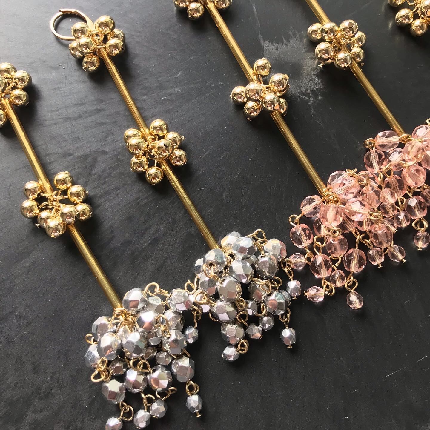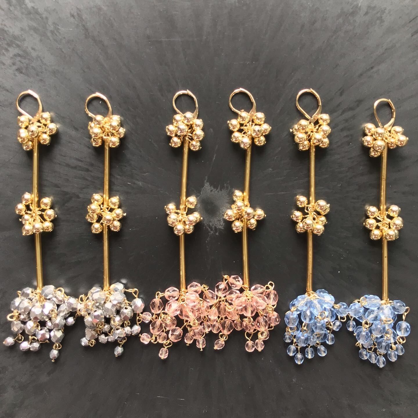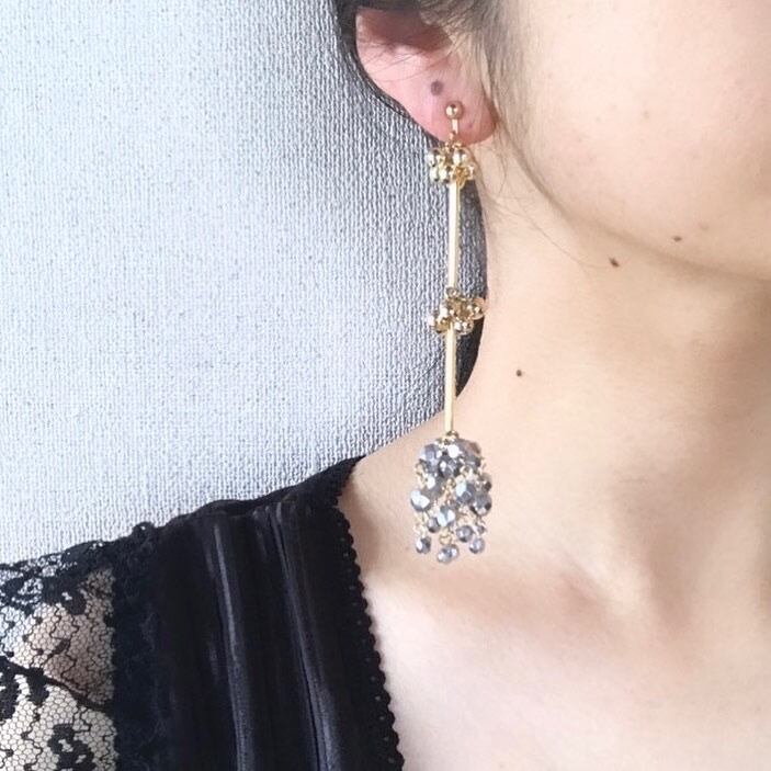 落ち着いた色味のビーズを沢山使い、大ぶりながらも大人っぽい印象のアクセサリーです。重さはほとんど感じずご使用いただけます。 重さ:約9g/個 ▽アレルギー対応について▽ ピアスはサージカステンレスに、イヤリングはネジバネ式のニッケルフリーに変更できます。ご希望の方は備考欄にご記入下さい。 ▽その他▽ アクセサリーは一つひとつ手作業で作成しております。パーツの配置等個々に多少の差が生じます。また製作中にワイヤーなによる微細な傷が付いている場合があります。何卒ご了承下さい。