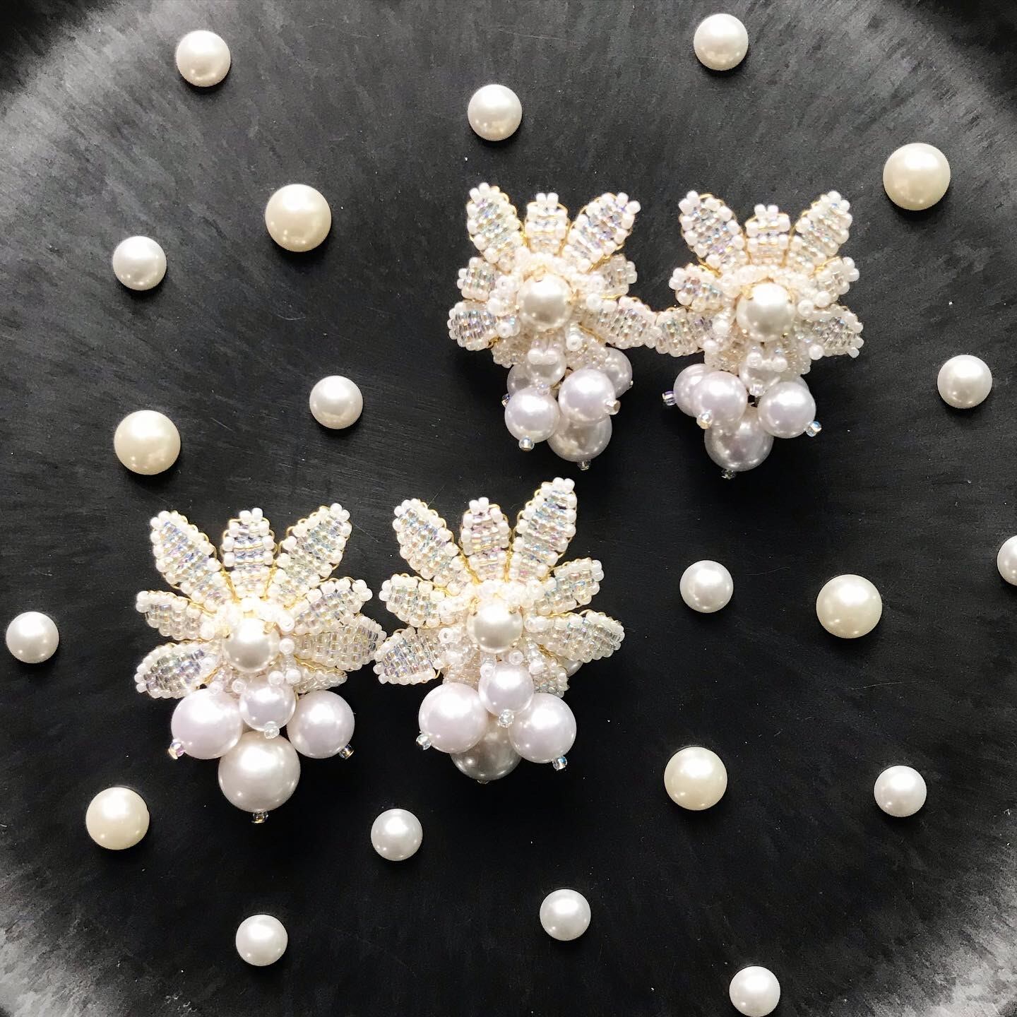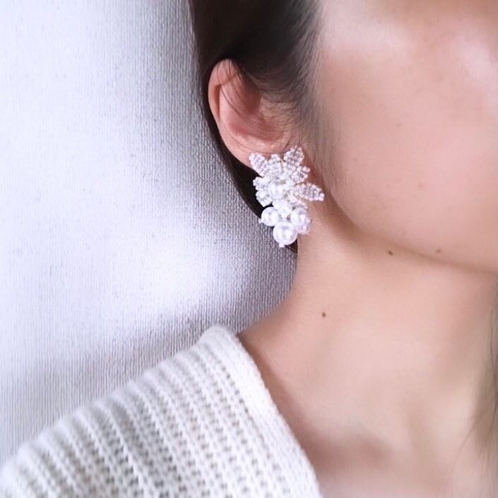 クリアカラーと艶のあるホワイトのビーズでフラワーモチーフを作りました。様々な大きさのパールを使用したりビーズで細かく作り上げた立体感のあるアクセサリーです。 ▽アレルギー対応について▽ ピアスはチタンポストに、イヤリングはニッケルフリーに変更できます。ご希望の方は備考欄にご記入下さい。