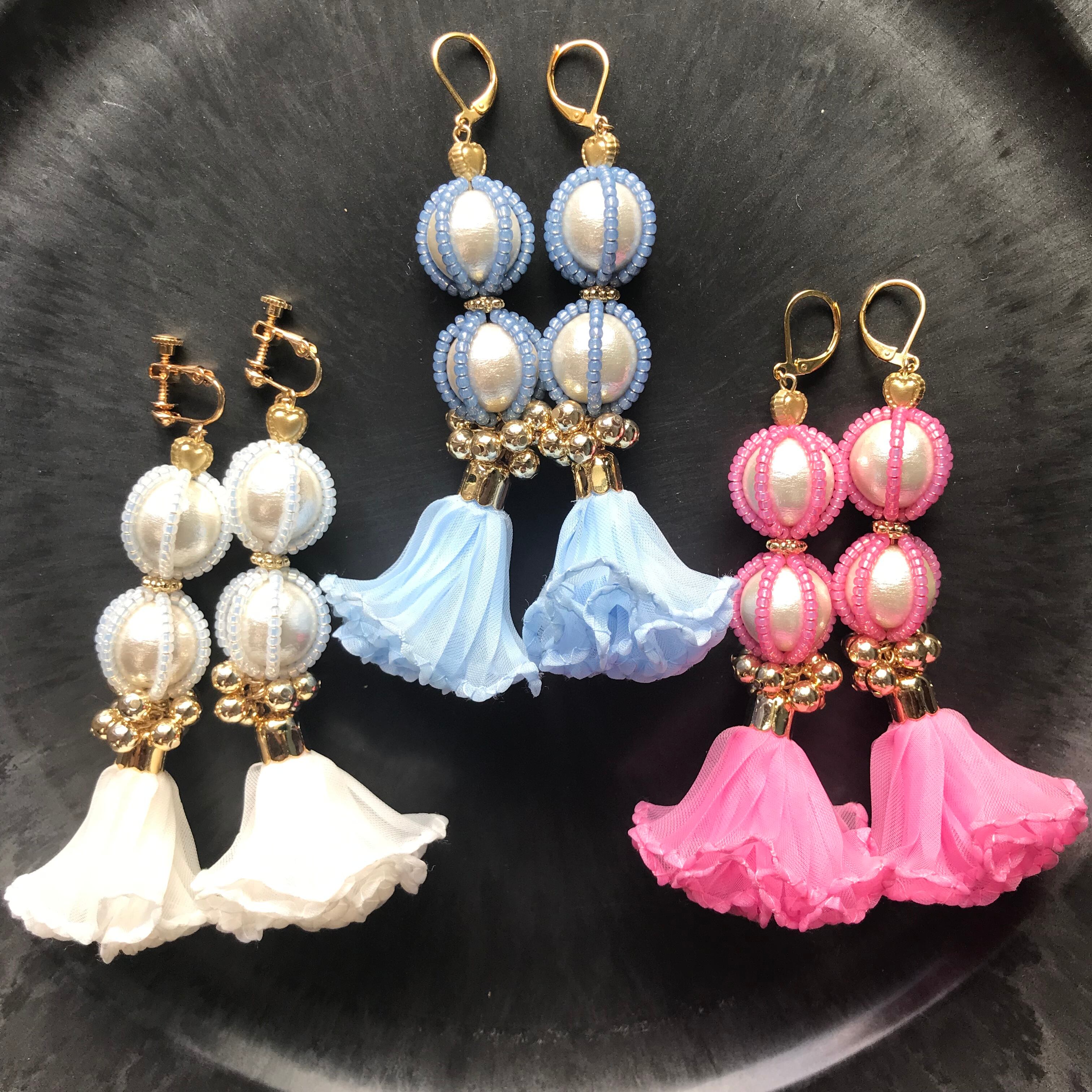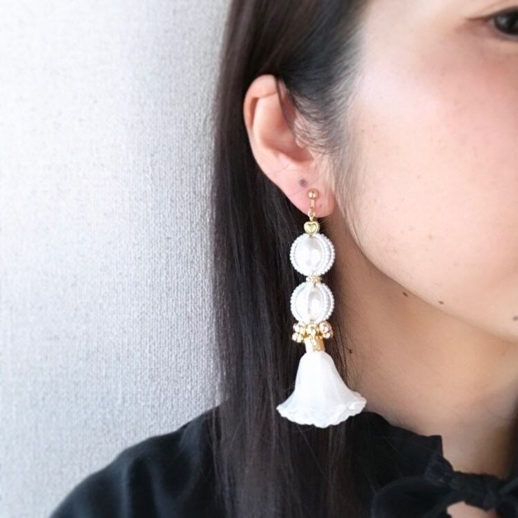 コットンパールの周りをビーズで彩り、同じカラーのレースでできたタッセルと合わせました。パールの上の小さなビンテージ調のハートがポイントです。コットンパールとレースのため軽く、耳にご負担なくご使用いただけます。 ▽アレルギー対応について▽ ピアスはサージカステンレスに、イヤリングはネジバネ式のニッケルフリーに変更できます。ご希望の方は備考欄にご記入下さい。