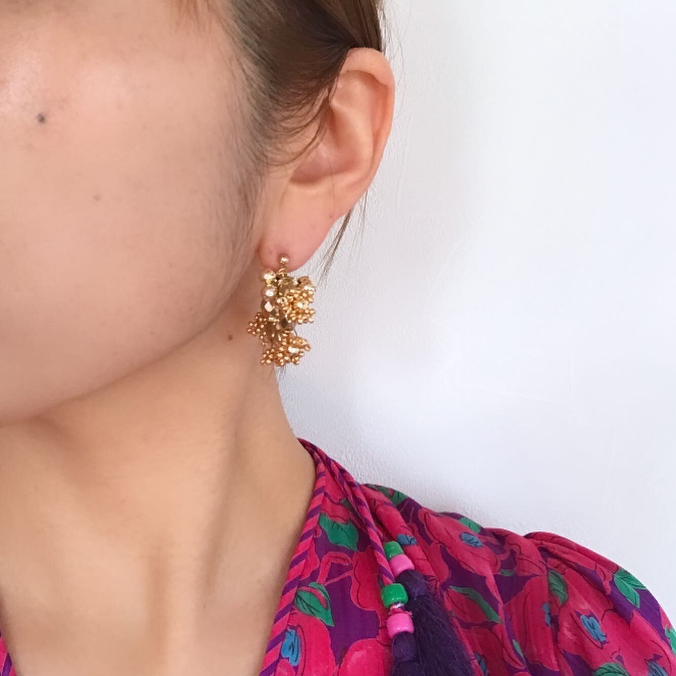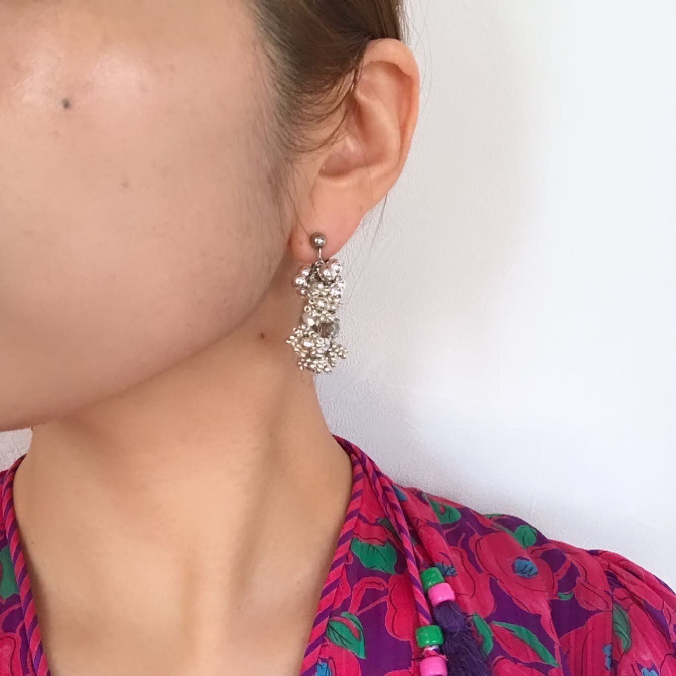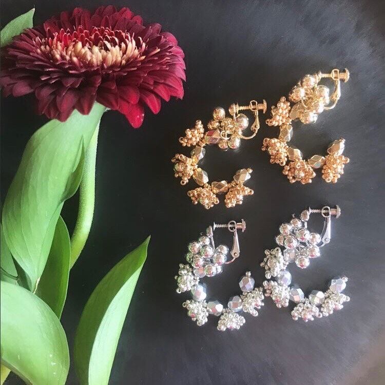 ゴールドとシルバーのワンカラーのアクセサリーです。多面カットのメタルビーズの間に小さなフラワーモチーフのビーズやラウンドビーズなどを組み合わせて作りました。重さはほとんど感じず、耳に負担なくご使用いただけます。